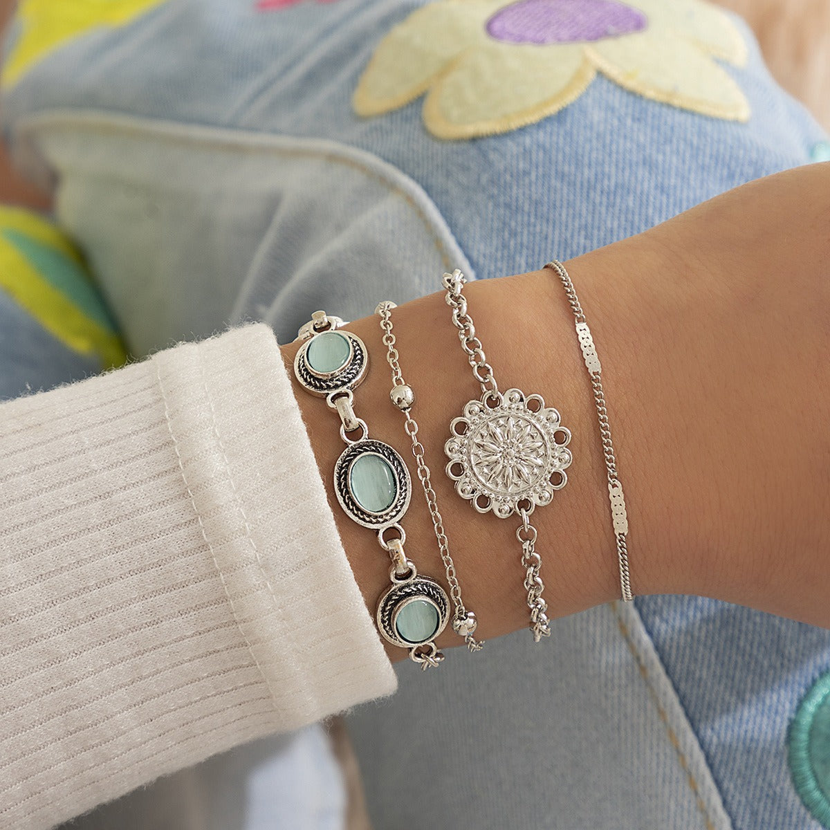 This ethnic-style cat's eye gold vintage bracelet features a unique flower disc design paired with a cat's eye design, embodying a rich ethnic charm and vintage appeal.