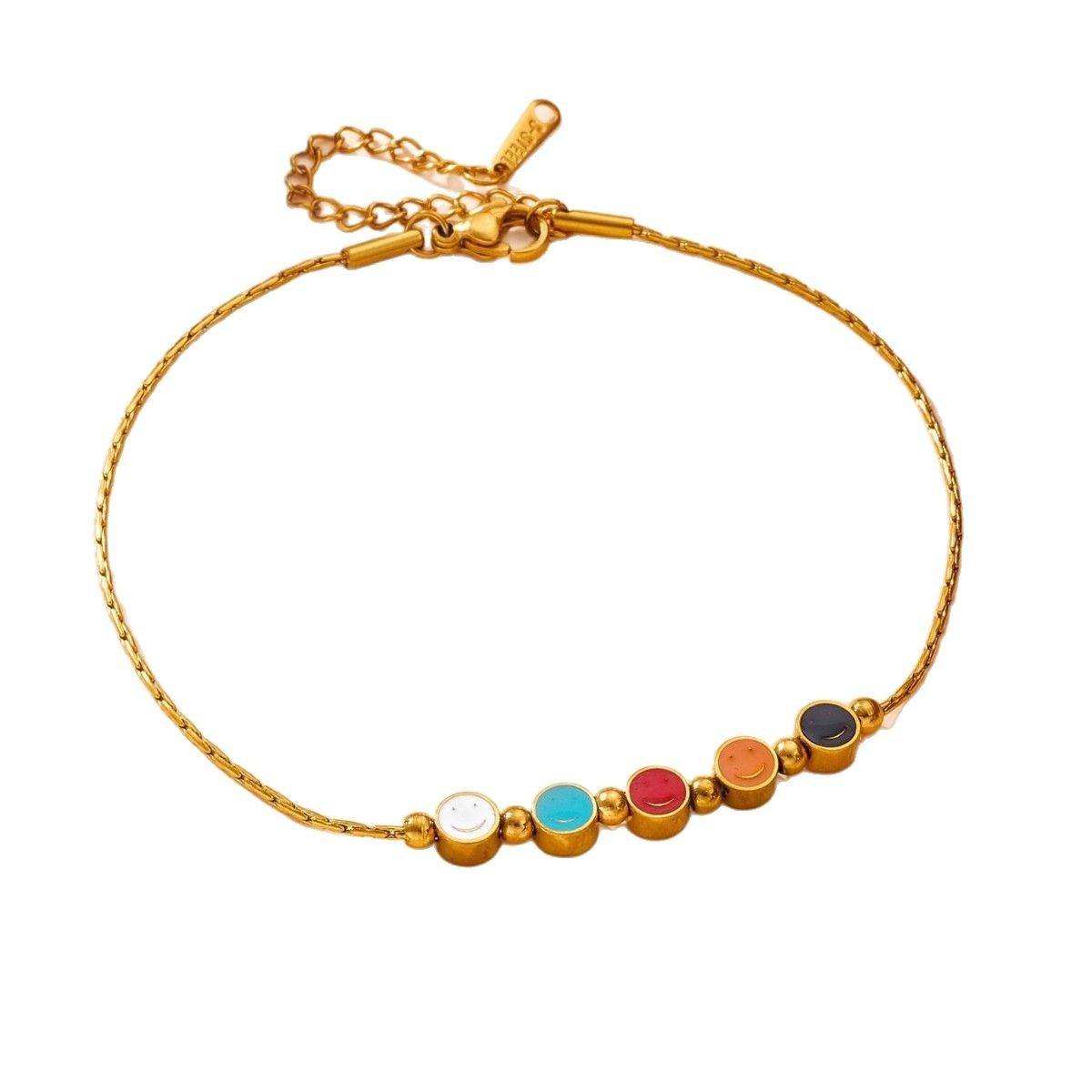 This bracelet features retro colorful smiley faces with interlocking rings, embodying a playful and unique style. Titanium steel lends it a tough, yet effortlessly luxurious feel, showcasing a sense of ease, vitality, and unique charm.
