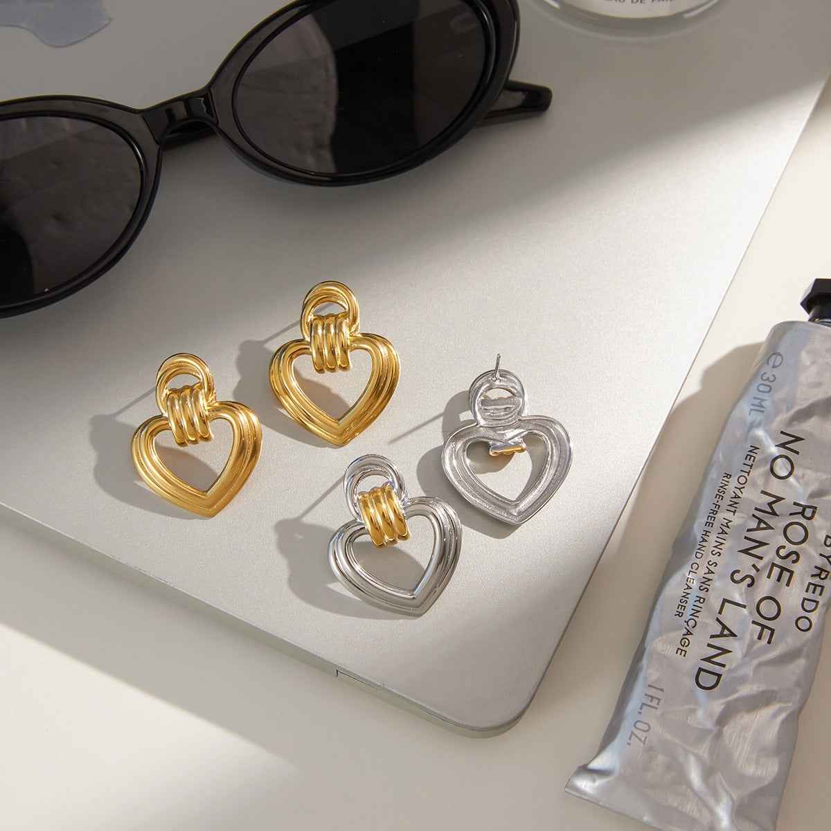 These 18K gold heart-shaped titanium steel earrings combine simple heart elements with a high-quality metallic texture, embodying both sweetness and restraint, subtly revealing a gentle and refined light luxury feel.