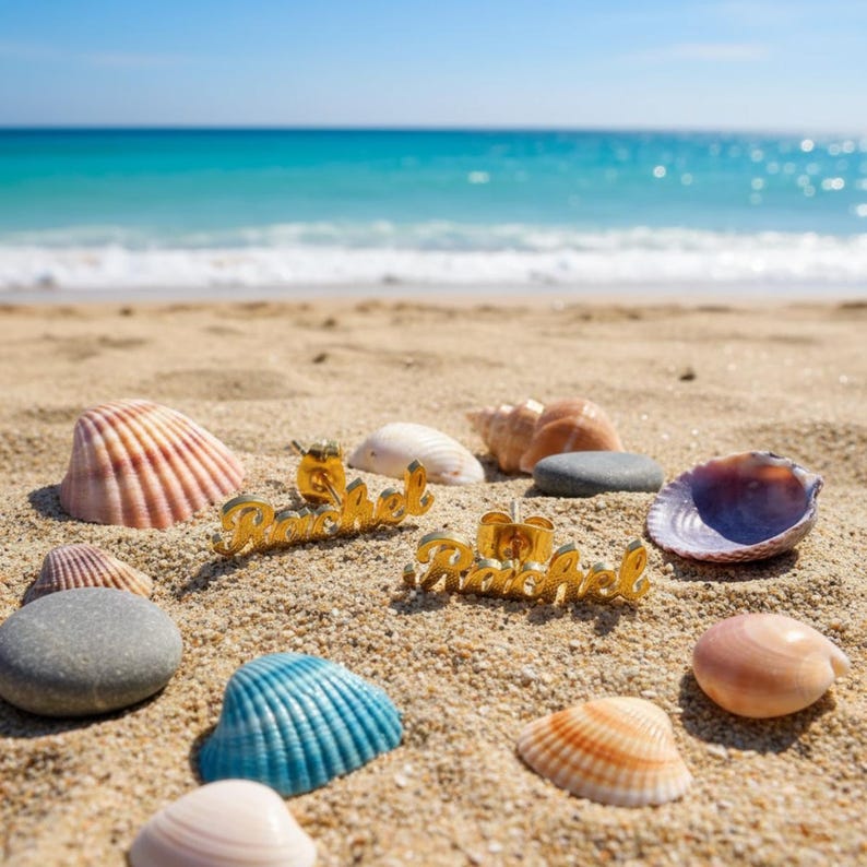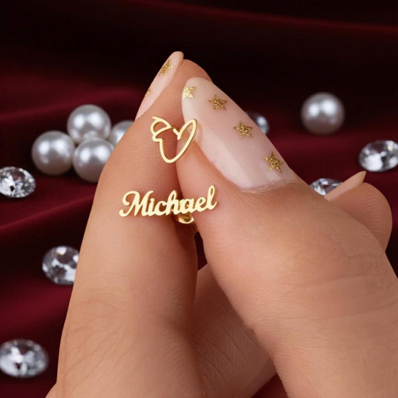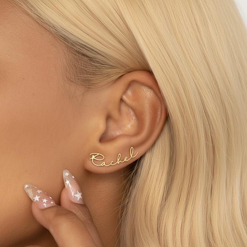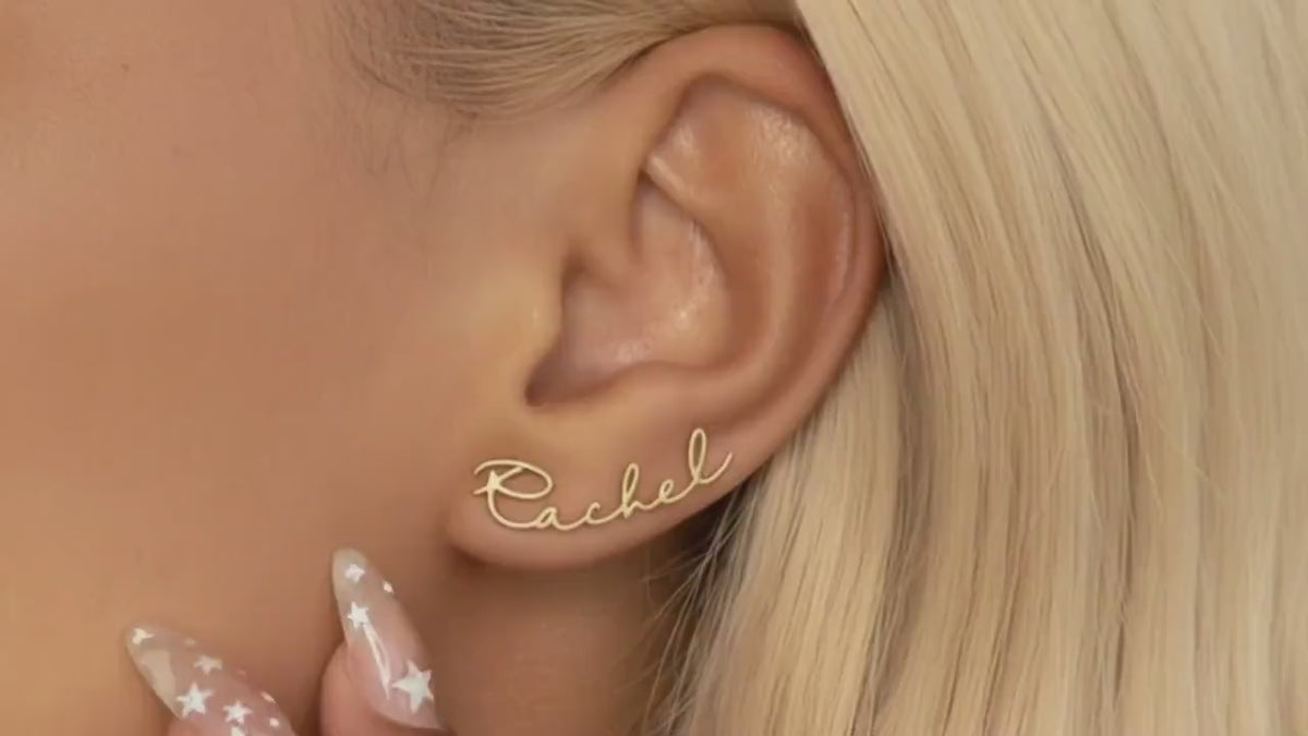 This stud earring is a fashionable and personalized piece of jewelry, featuring a gold-tone design with an elegant script name custom pendant (as shown "Sarah"). It is designed to sit snugly on the earlobe, adding a touch of sophistication and personalization to any daily style.