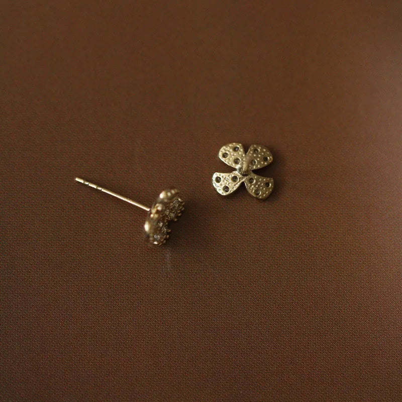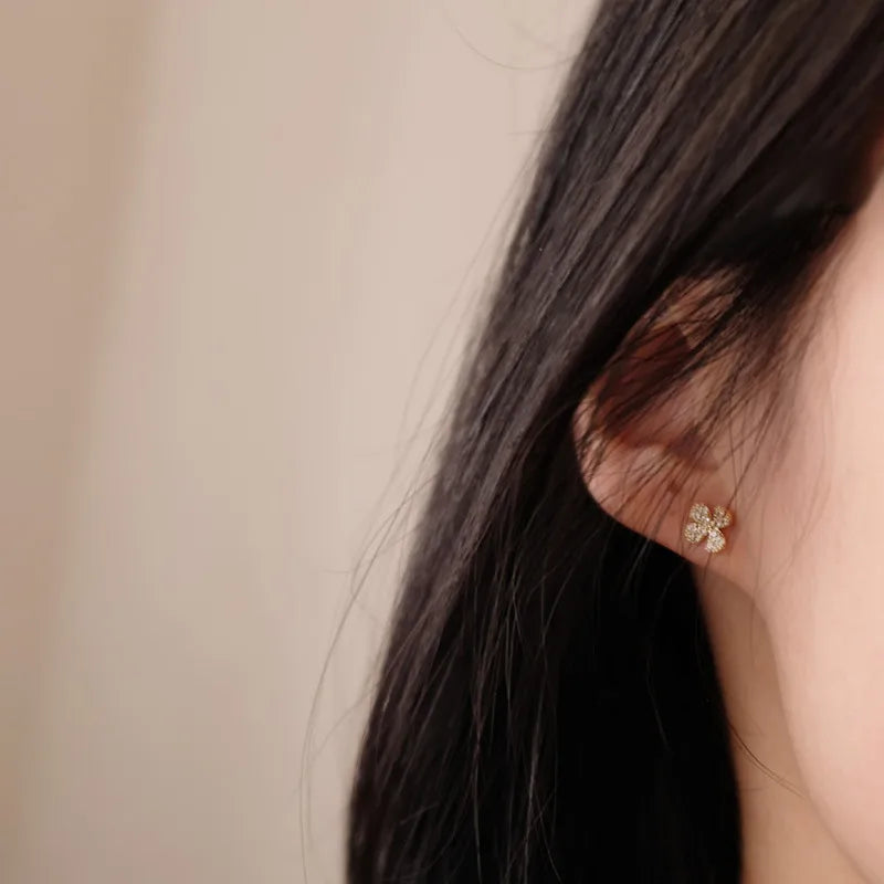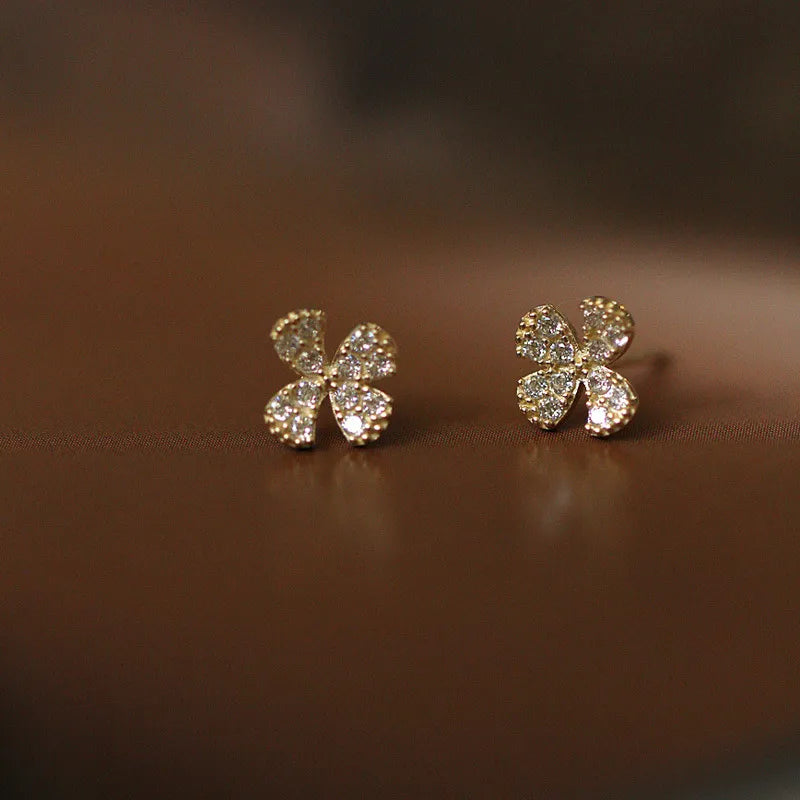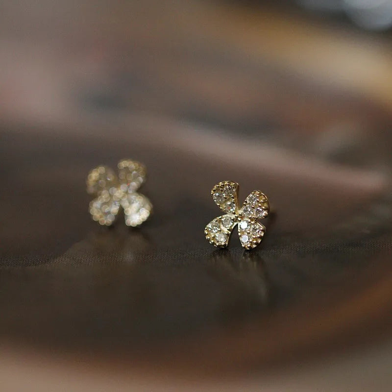 Lucky Four-Leaf Clover Flower S925 Sterling Silver 14K Gold Plated Diamond Stud Earrings for Women Petal Jewelry