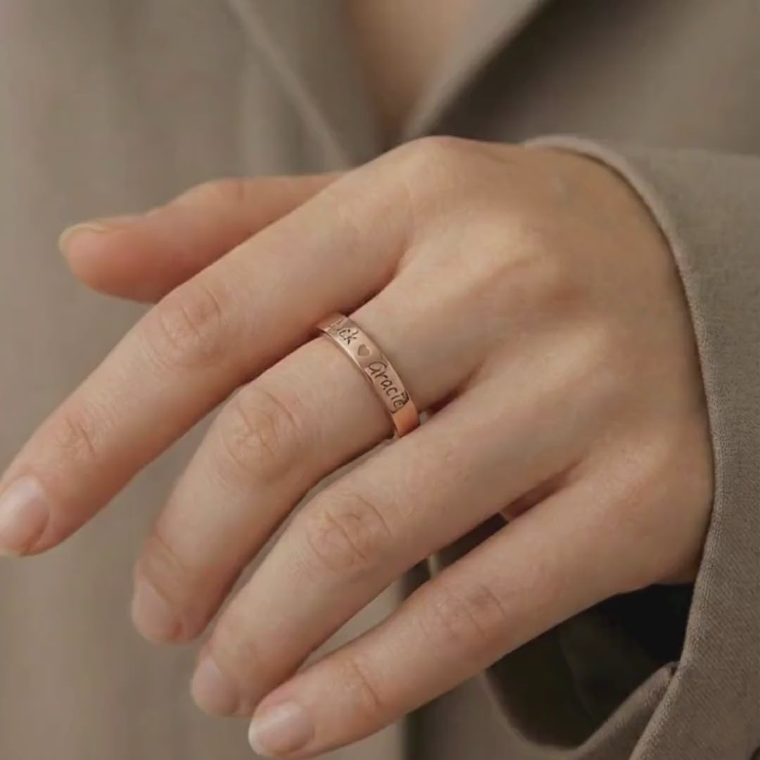 This ring is based on a minimalist and exquisite smooth band design, subtly blending unique custom name elements to showcase a distinctive fashion charm. You can wear a name of personal significance (like "Jack ♡ Gracie" in the image), making it your exclusive emblem or a special gift.