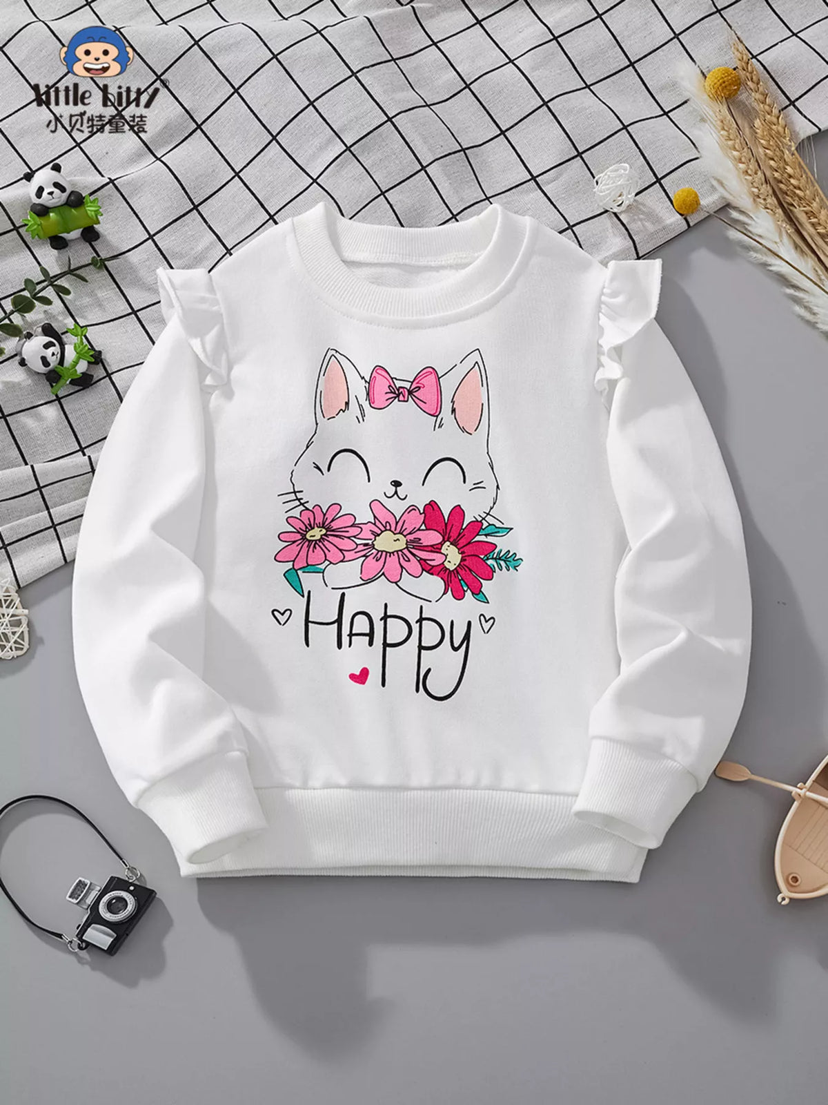 Children's Cat Graphic Ruffle Sleeve Sweatshirt