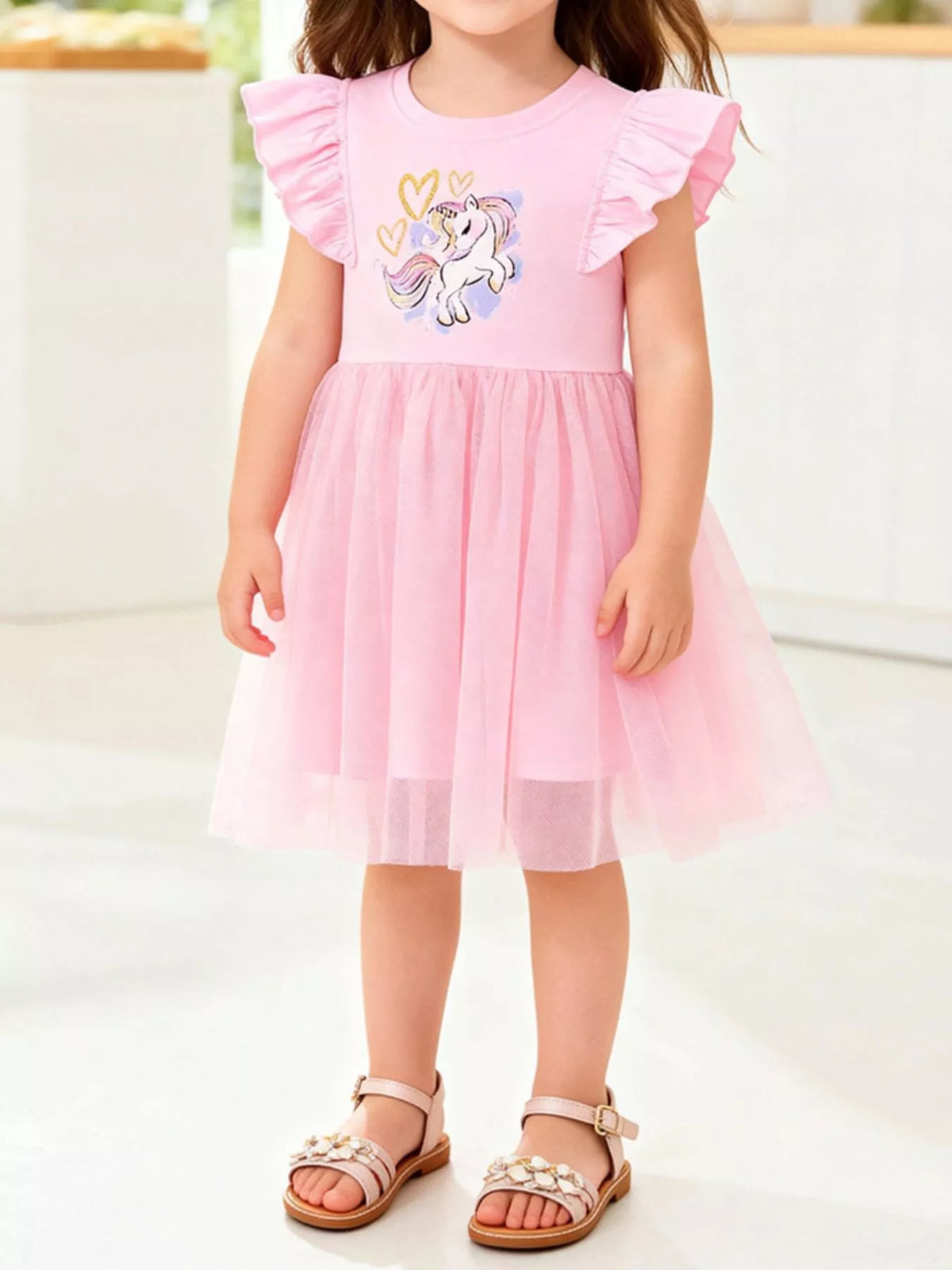 Children's Unicorn Graphic Ruffle Sleeve Tulle Dress - Blush Pink / 2Y