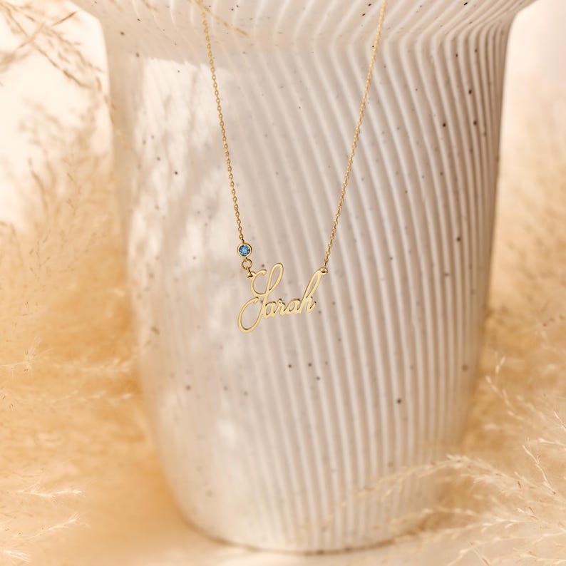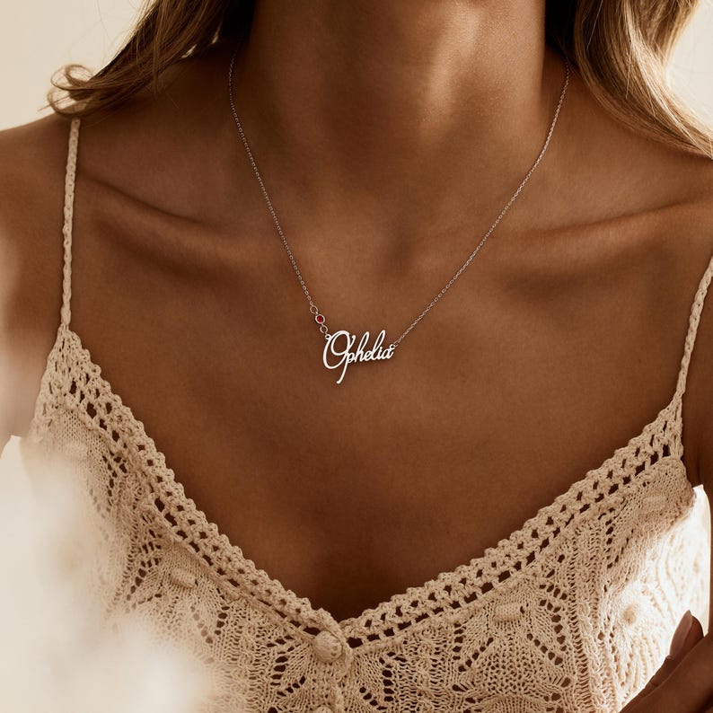 This necklace is based on a minimalist and exquisite design, integrating personalized customization elements (birthstone and cursive name), to showcase unique fashion charm. By freely customizing the name and the embedded gemstone, you give the necklace a one-of-a-kind personality, making it your exclusive symbol or a special gift.