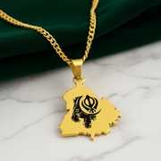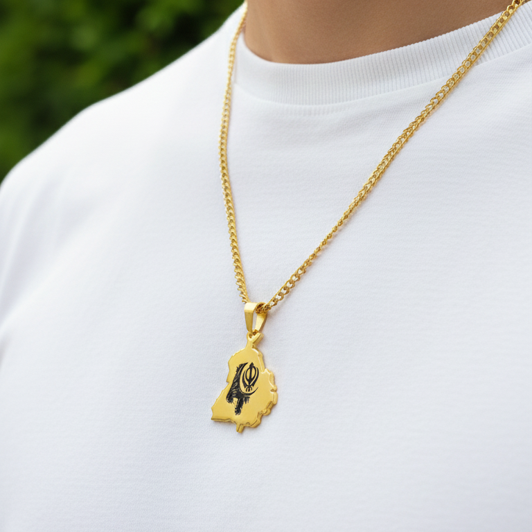 Cultural Symbolism: The pendant combines a Punjab map and the Khanda symbol, which includes a double-edged sword, a ring, and two single-edged swords, symbolizing sacred knowledge, eternity, and the balance between spiritual and secular authority.
