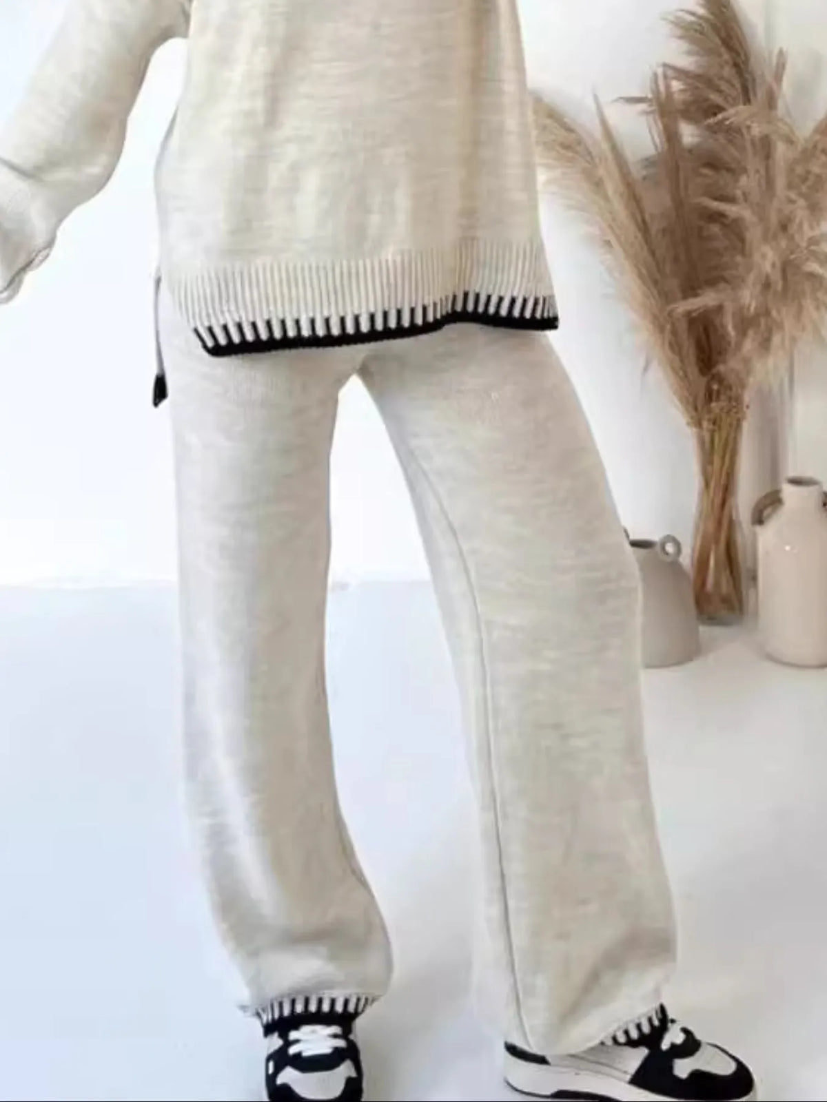 This stylish black sweater set features a round neck top with contrasting white trim details and matching wide-leg pants. Made from soft knitted material, the set offers ultimate comfort with its relaxed oversized fit. The top showcases decorative white edging on the neckline and hem, while the high-waisted pants provide a flattering silhouette. Perfect for casual outings, lounging, or creating an effortlessly chic look. The coordinated two-piece design ensures a put-together appearance with minimal effort, making it ideal for modern women seeking both comfort and style.